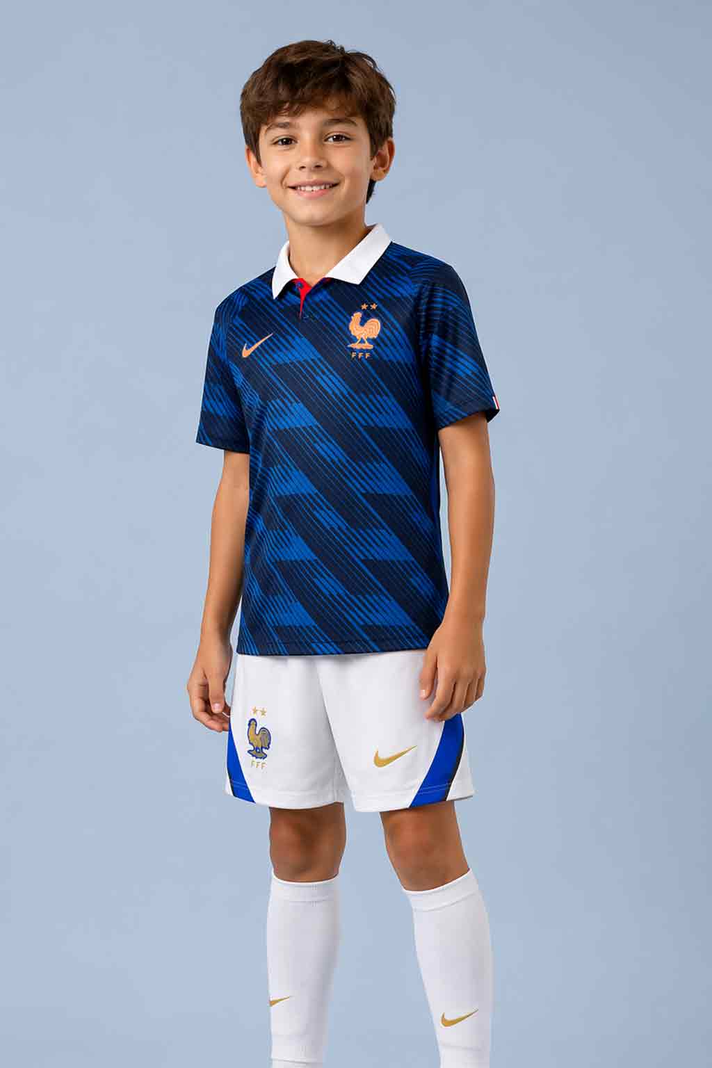 The Kids France Home World Cup 2026 Jersey With Shorts is a coordinated jersey-and-shorts kit made for young France fans. It’s comfortable for football practice, school games, and casual wear. Customisation is available—add a name and number in original France-style fonts and colours.