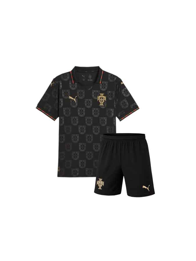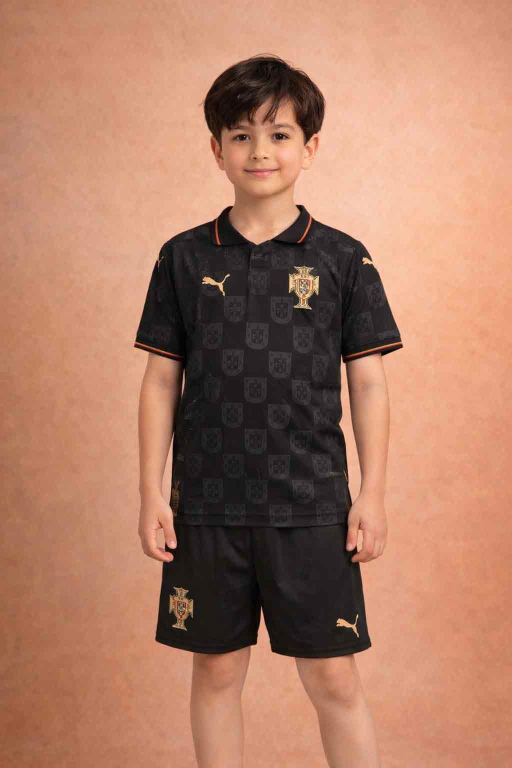 The Kids Portugal Eusébio Black Special Edition World Cup 2026 Jersey with Shorts is a coordinated jersey-and-shorts kit made for young Portugal fans. It’s comfortable for football practice, school games, and casual wear. Customisation is available—add a name and number in original Portugal-style fonts and colours.